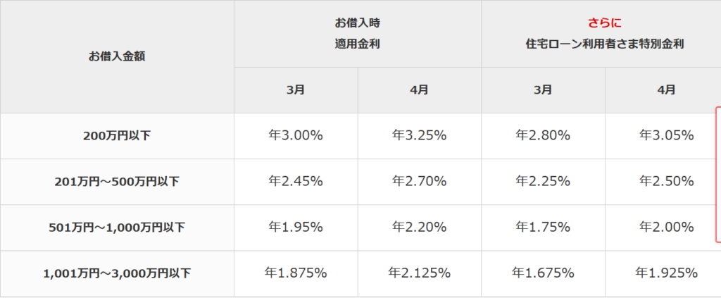 住宅ローンで利用している銀行。変動金利で借入金額問わず一律3.125%(住宅ローン契約あり条件)。2年ごとに返済金額が見直されます。申込時に融資日として最短10営業後から選択できた。本審査通過後に融資日を早められないのか電話したが、最低でも8営業日前までしかできないとのことでした。今回はすでに7営業日前だったのでどうしようもなかったです。