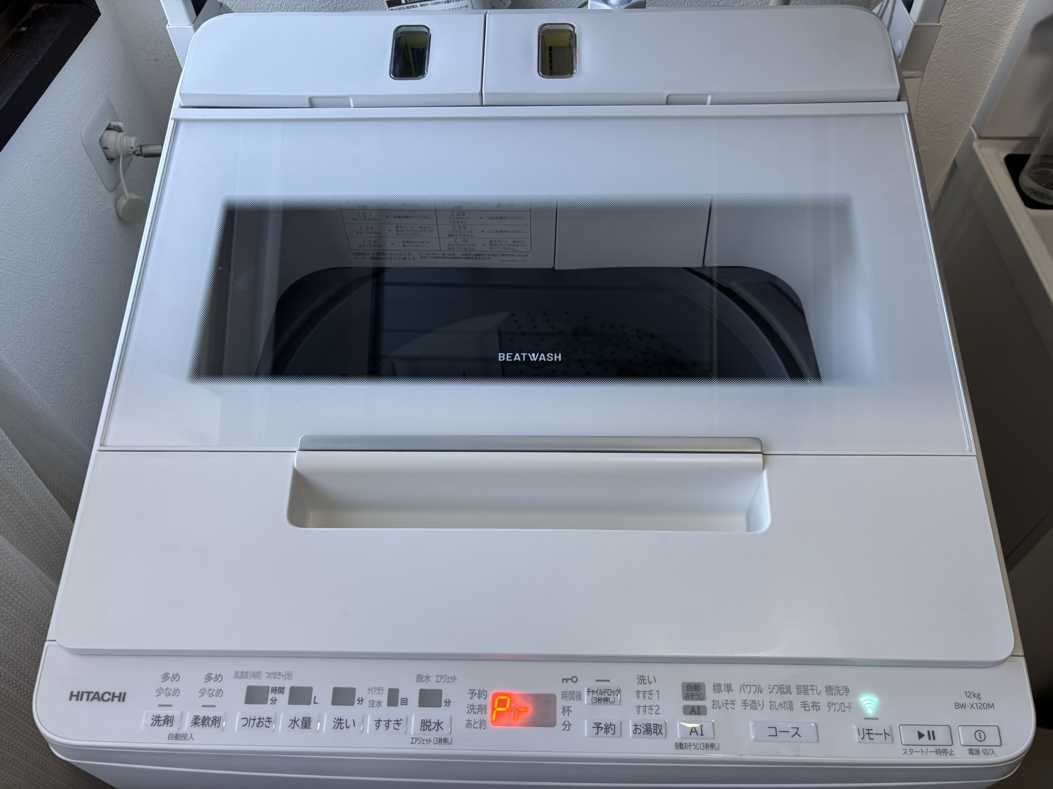 日立の縦型洗濯機のビートウォッシュ12kgです。BW-X120M。2025年モデルです。各社12kg販売していますが、ビートウォッシュが唯一蓋を開けた時の高さが130cm切っていました。そのため、乾太くん専用台の下に何とか入りました。