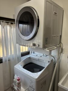 こんな感じで、乾太くんの下にきれいに収まりました。シンデレラフィットです。ふたもぎりぎり干渉しません。これで洗濯12kg、乾燥9kgの最強コンビになりました。