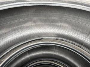 サイドはひびが目立ってきていますが、内部のワイヤーはまだ見えていないので、正直全然使えますね。外見上ではJATMAが出している危険度の目安でもまだ注意レベルです。年式に対する保管状態はよいです。トレッド面も経年劣化はしているが、ただちに問題があるような状態ではなかったです。ただし内部は見えないので、そこだけが気がかりでした。
